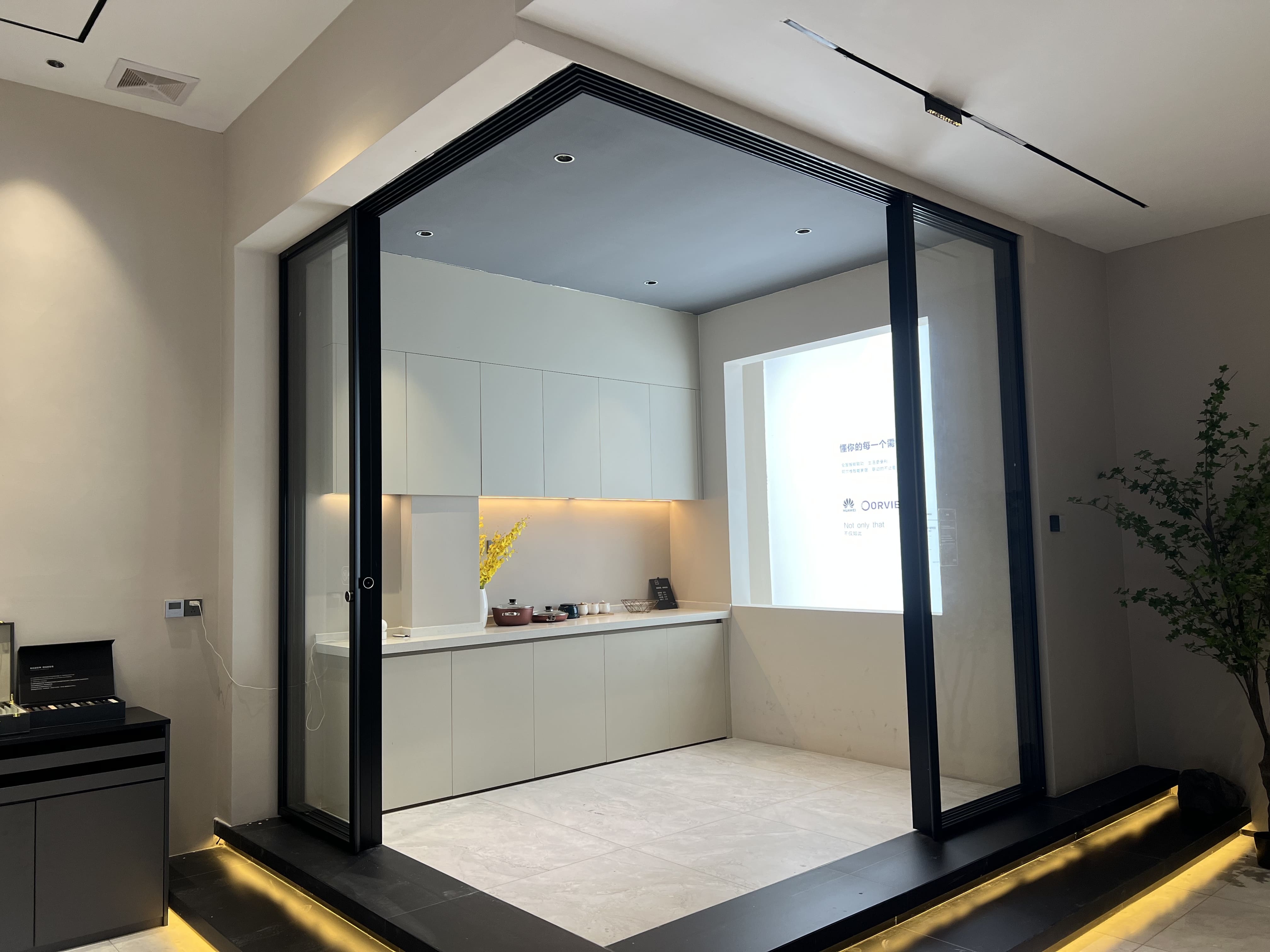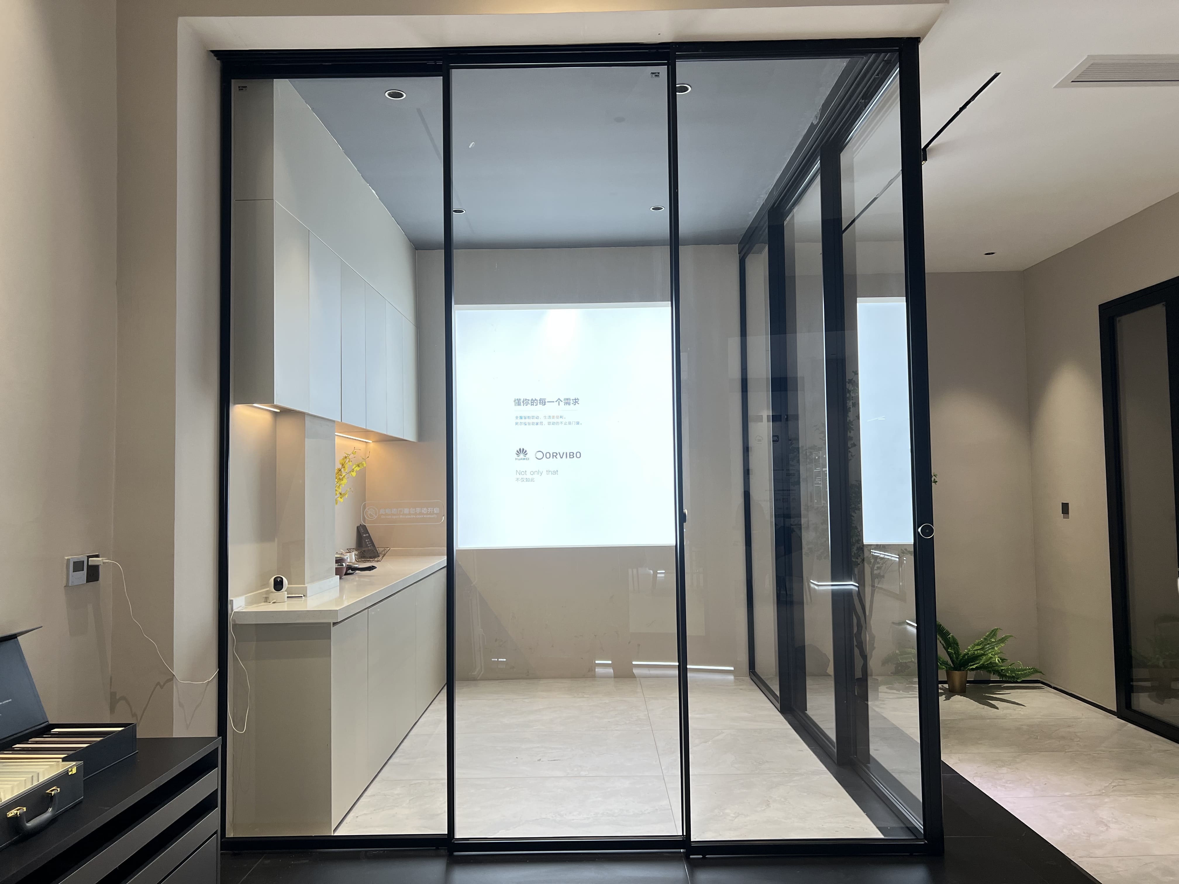 The cubicle sliding door creates flexible zones while maintaining a clean, modern layout.